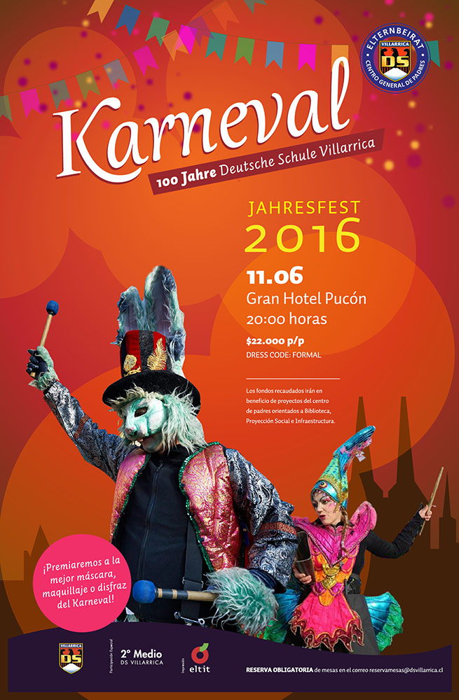 Este 2016 nuestro lema es “Celebremos juntos los 100 años de nuestro colegio”. Traemos a escena una tradicional y colorida fiesta alemana: el Karneval para celebrar juntos esta fecha especial. Los esperamos con mucho entusiasmo, y así aprovechar la oportunidad para cooperar en pro de los avances de nuestro colegio y por ende de nuestros hijos.